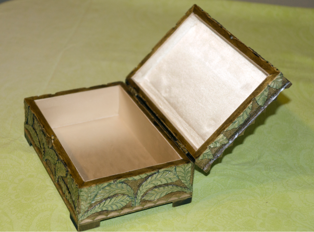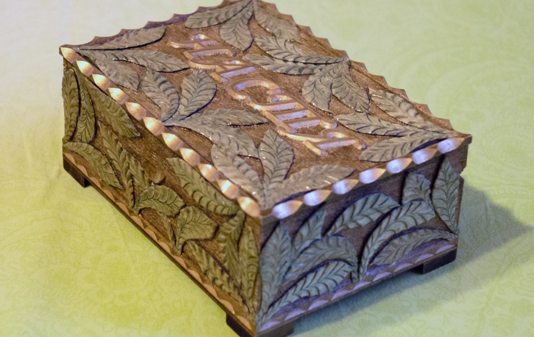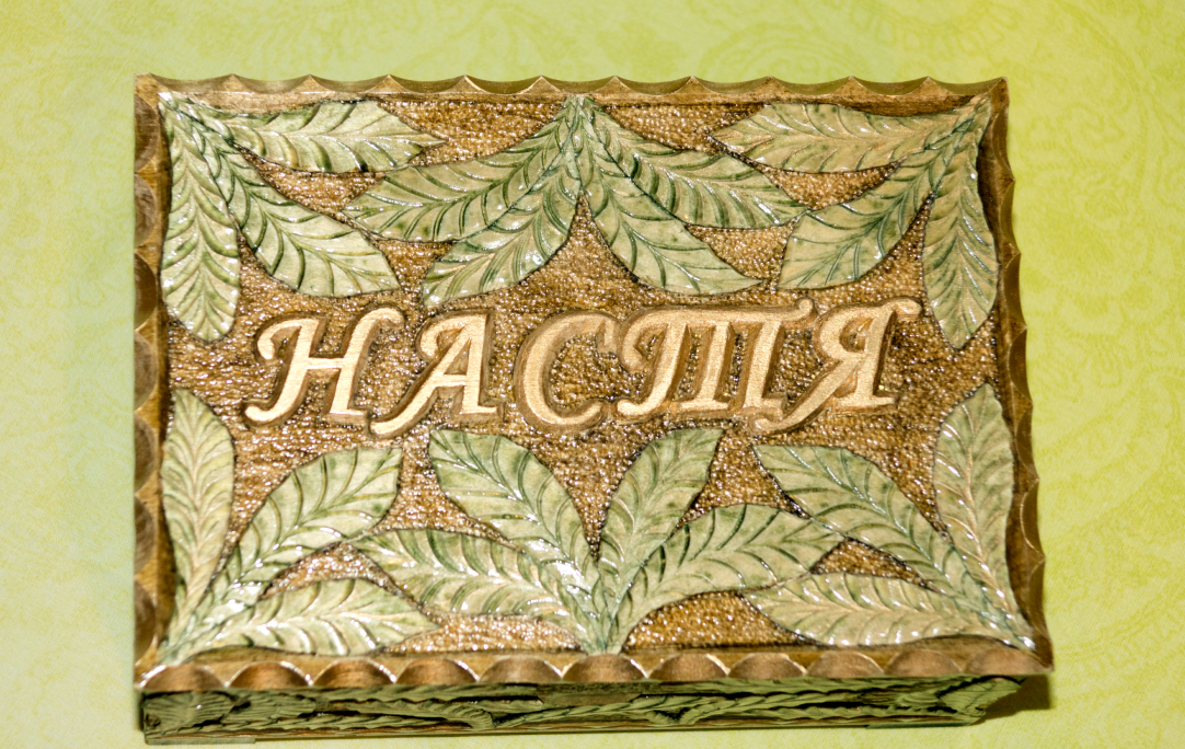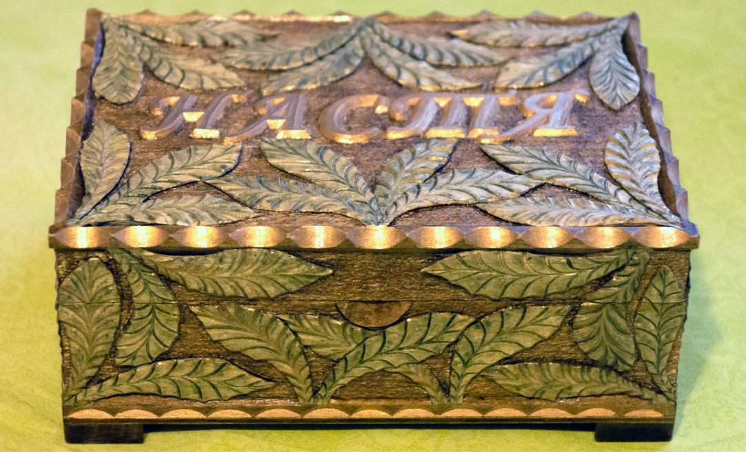 Шкатулка выполнена из липы, внутри обита атласной тканью. В качестве орнамента использовалась растительная тематика по просьбе заказчика. Покрыта глянцевым лаком.