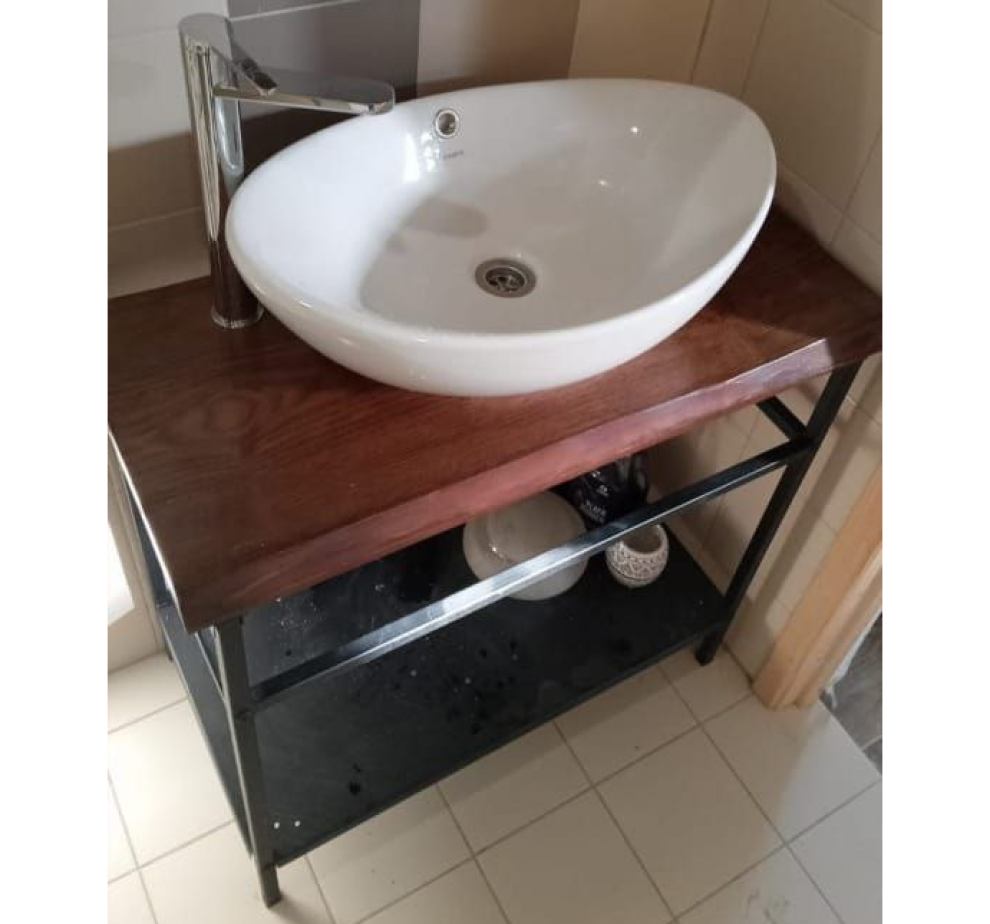 Столешница выполнена из массива ясеня, затонированна под “орех” и покрыта полуматовым лаком. Подстолье выполнено из профильной трубы и покрыто черной эмалью.