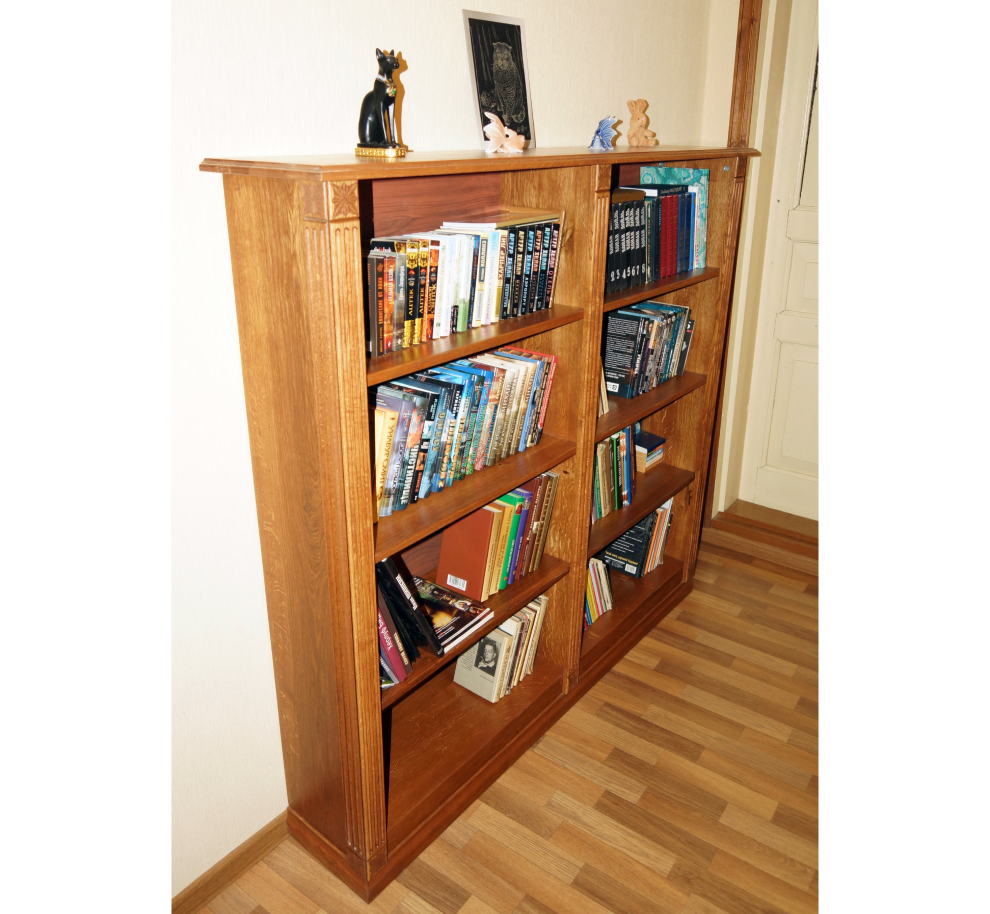 Стеллаж выполнен из массива дуба собранного в щиты и покрыт коллированным маслом (цвет “Брэнди”). В качестве финишнего покрытия использовался твердый воск.