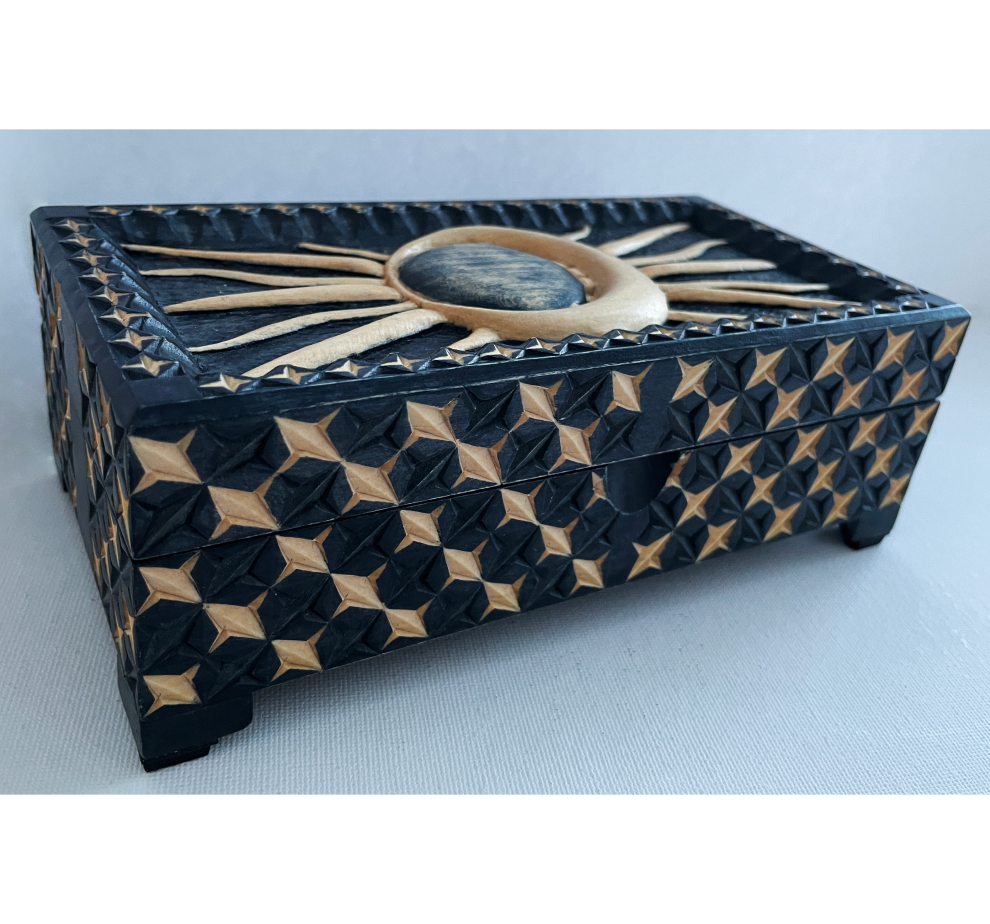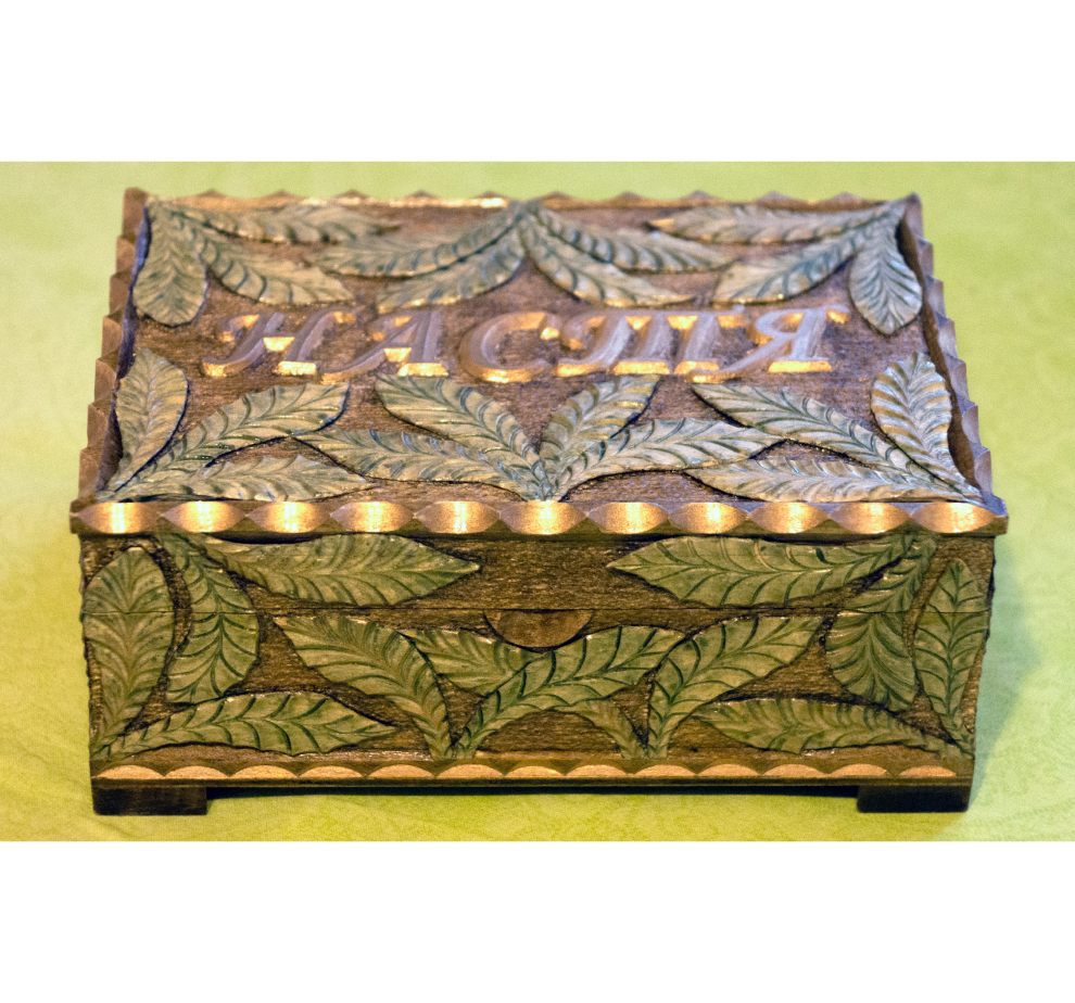 Шкатулка выполнена из липы, внутри обита атласной тканью. В качестве орнамента использовалась растительная тематика по просьбе заказчика. Покрыта глянцевым лаком.
