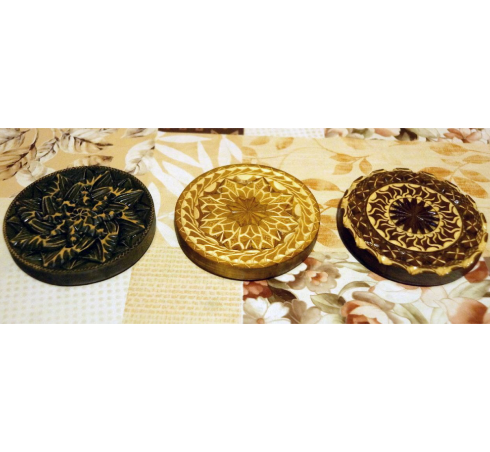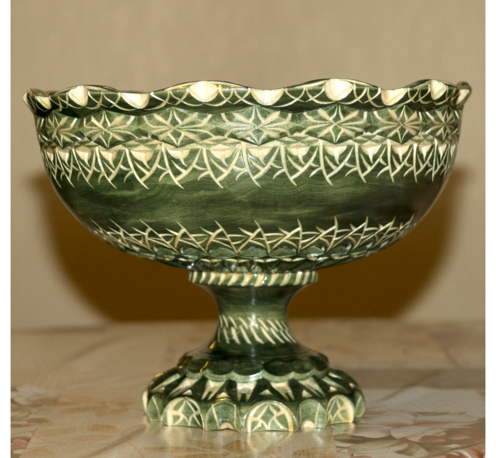 Фруктовница выполнена из массива липы и стилизована под малахит. В качестве орнамента применялась комбинированная геометрическая резьба. Поверхность контактирующая с продуктами обработана пчелиным воском, остальные глянцевым лаком.